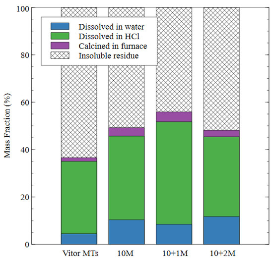 For the test presented in this paper, a 2 g specimen of alkali-activated mine tailings was first added to a beaker filled with 250 mL of ultrapure water and magnetically stirred for three hours. The mixture was dried in an oven overnight at 100 °C, and the mass was then recorded before proceeding with the HCl dissolution. The remaining specimen was added to a beaker with 250 mL of 1:20 dilution of HCl (1.4 M) and magnetically stirred for three hours. Instead of filtering the residue, the solution was progressively diluted with ~2 L of water, and the liquid was decanted. The specimen was dried again in an oven at 100 °C and the mass was recorded. The final step of calcination was the same as the original method presented in [37]. The residue from the HCl step was added to a ceramic crucible and placed in a furnace at 1000 °C for at least 12 h. The mass was recorded again, and the quantity of each phase was determined by finding the percentage of mass loss experienced in each step (water, HCl, furnace).