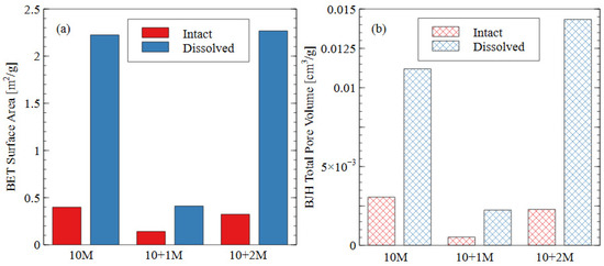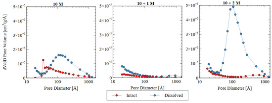 The pore size distribution constructed from nitrogen adsorption analysis is shown in Figure 9. The summary statistics from the NAD analysis are shown in Figure 10, including the specific surface area and total pore volume. AAMs are considered mesoporous materials, which contain pores primarily between 20 and 500 Å [48]. The “hump” observed in the pore size distribution for the 10 M and 10 + 2 M dissolved specimens illustrates this phenomenon well. The voids within the matrix of the AAMs indicate that there were gaps between the nanoprecipitates that make up the aluminosilicate gel [49]. Therefore, an increase in the total pore volume indicated that the aluminosilicate gel in this study had been dissolved or damaged, increasing the average distance between each nanoprecipitate component. Similarly, an increase in the specific surface area indicated that the solid fraction of the matrix had become more porous, and the extent of the voids had increased correspondingly.