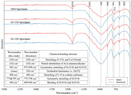 The FTIR spectra of intact and dissolved AAMs is shown in Figure 11, with the peak locations and associated bonding structures presented in the inset table. The sharp band at 1426 cm−1 indicated the stretching of the –CO3 and Ca–O bonds [50,51,52]. The presence of CO3 can be attributed to the formation of calcite, which is mainly composed of calcium carbonate. This reaction can happen when an AAM specimen is exposed to carbon dioxide in the atmosphere. The fact that calcite is easily dissolved upon immersion in water explains the absence of this peak in each of the dissolved spectra. The band at 880 cm−1 can be attributed to C–O stretching in sodium carbonate, which forms in the same way as calcite [53]. This compound also dissolves easily in water, which explains the absence of the 880 cm−1 peak in the dissolved specimens’ spectra. Because all the specimens were exposed to the same environmental conditions, atmospheric carbonation was not expected to contribute to the observed differences among the specimens.