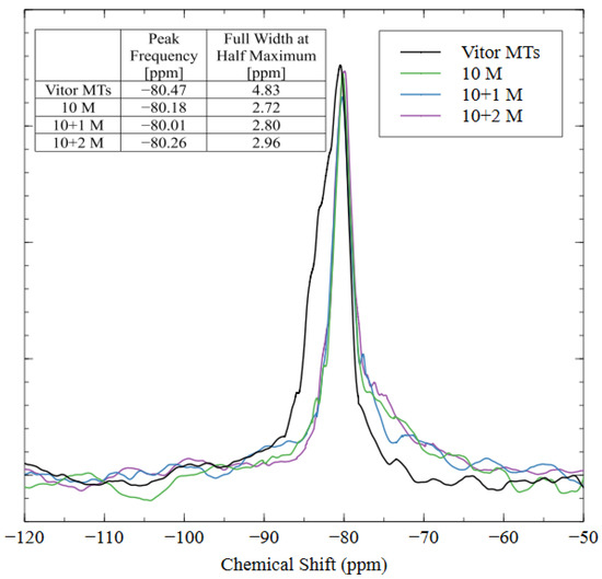 Nuclear magnetic resonance (NMR) was used to show the coordination states and bonding structure of the silicon atoms in the AAM matrix. The spectra for the raw tailings and all three AAMs are shown in Figure 13. The peak frequencies and widths for the various coordination states of silica are well documented in the literature [33]; the Q0–Q3 peaks are located at −72, −81, −89, and −97 cm−1, respectively. The NMR results show that the spectra were similar for the raw tailings and each alkali-activated specimen, with slight differences due to the increased incorporation of Q2 and Q3 coordinated silica in the 10 + 1 M and 10 + 2M samples. Each spectrum exhibited a sharp peak between −80 and −81 cm−1, which corresponded to the Q1 coordination state of the silica, meaning that each silicon atom was incorporated into the matrix by only one bridging oxygen, and the other three bonding sites were occupied by an –OH group. This result indicates that the polymerization process was incomplete since the characteristic cross-linkages require higher coordination states of Q3 and Q4 [59,60]. Since the peak is very sharp, it does not appear to be composed of multiple overlapping signals, and, therefore, deconvolution was unnecessary.