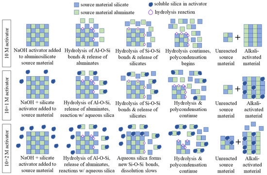 When the source material (raw mine tailings) was dissolved by the alkali activator, the chemical bonds were hydrolyzed (attacked by water) and the alumina was released in the first step. The release of the alumina produces a silica-rich surface precursor, which is then further dissolved to release the silicates [63]. In the sodium hydroxide-only mix design (i.e., 10 M), the hydrolysis of the chemical bonds in the source material continued and the silicates and aluminates that were released reacted to form longer aluminosilicate chains. This was a condensation reaction, where a new bridging oxygen was formed from two hydroxide (–OH) groups and a water molecule was released. This process is shown in the top third of Figure 14 (10 M activator).