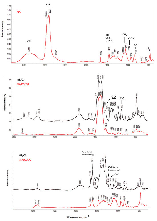 The caffeic acid in NS/CA is characterized by a low intense peak at 1242 cm–1, corresponding to the vibration of the hydroxyl in the benzene ring, which further disappeared in the NS/DS/CA spectrum. The other strong maxima correlate with the carbonyl stretching of the benzene moiety (in caffeic acid) and the C-C stretching of benzene and of acyclic chains at 1642 cm−1 and 1619 cm−1, respectively. The intensity of the carbonyl band decreased due to the formation of new bonds in the reaction of the carbonyl groups of dialdehyde starch/caffeic acid and hydroxyl groups of native starch (caffeic ester formation) (the maximum at 3375 cm−1 disappeared, Figure 1). In addition, the vibration maxima at 1185 and 1535 cm−1 of the ring-conjugated C=C stretching in the NS/CA of coniferaldehyde and sinapaldehyde disappeared in the NS/DS/CA spectrum [23]. Raman spectroscopic analysis also confirmed the mutual interaction between the NS/QA and NS/DS/QA mixtures. The spectral regions at 1500–1200 and 1200–300 cm−1 are assigned to –CH2 (wagging and rocking modes), carboxyl groups, and –OH deformation, respectively, corresponding to the cyclohexane ring of quinic acid [9]. Blending with dialdehyde starch caused all the signals characteristic of NS/QA to decrease in intensity (maxima at 1415, 940, 852, and 483 cm−1). Additionally, some maxima disappeared (at 1457, 1149, 1106, 766, and 671 cm−1).