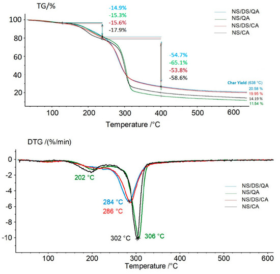 TG and DTG curves of “NS/QA”, “NS/DS/QA”, NS/CA”, “NS/DS/CA”.