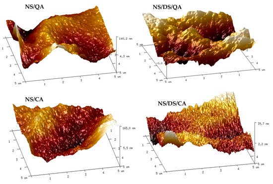 Differences in the surface morphology of the starch films are also related to the composition of the mixture. They can be estimated by the roughness parameters of the mean roughness (Ra) and mean square roughness (Rq). The AFM images showing the surface topography of the starch-based films are presented in Figure 5. Compared with those of the other samples, the surface of the native starch film displayed finer corrugation and lower Ra and Rq values (Table 1). Although the blend topographies do not differ significantly, the NS/DS/QA blend has the most uneven surface, while the NS/DS/CA sample is a material with a relatively smooth and compact surface and roughness parameters below 10 nm, which confirm the good physical intercalation of additives in this starch blend.