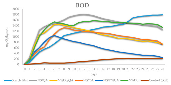 The biodegradation of packaging materials can be monitored by measuring the biological oxygen demand (BOD) of microorganisms during the degradation of polymers in the soil environment [7,39,40]. For this purpose, the OXI TOP technique was applied, and the determined BOD results (shown in Figure 6) confirmed the biodegradability of all the tested materials. However, their biodegradation rate depends on the characteristics of the component. The BOD values measured for all starch samples were repeatedly greater than those in the control (endogenous soil respiration). The modified starch films were characterized by a greater tendency to biodegrade up to the 12th day, after which the process slowed.