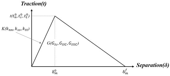 where the is the power-law parameter, and , , and are the mode I, II, and III strain energy release rate (SERR), respectively, while , , and are their corresponding critical values where they represent the areas under the bilinear CZM.