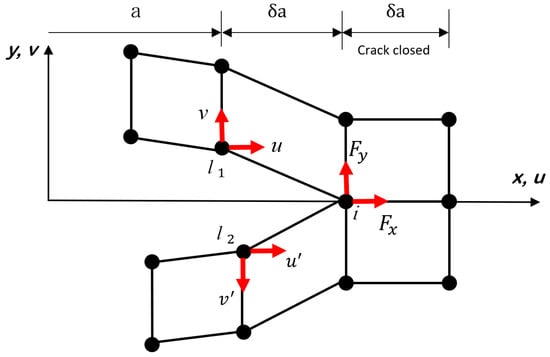 VCCT [36,37], which is based on the principle of linear elastic fracture mechanics (LEFM), is a well-known technique, like CZM, for simulating crack initiation and propagation along a pre-defined surface in 3D or a curve in 2D. VCCT is a method for the evaluation of SERR and mode-mixity ratio for cracks and assumes that the strain energy to be required for a new crack-face extension is equivalent to the one required for closing the same crack back to its original length in a 2D FE model in either plane-stress or plane-strain conditions; for example, Figure 2 shows the node separation by using VCCT when simulating the pure mode fracture. An initial crack front splits into two nodes l1 and l2 to form a new crack front at node i, while u and v denote the displacements in the direction of x and y, respectively. The SERR for pure mode I and II fracture based on VCCT are computed as follows: