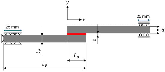 In this paper, the commercial finite element software Abaqus [41] is used for predicting the load-displacement curves of SLJs. Although a 3D FE model could obtain more accurate results, a 2D model is generally preferred for parametric studies. To validate the proposed studies, the FE model of SLJ was built and compared to the experimental data from the literature [35]. The geometry and dimensions of the SLJ are shown in Figure 3. A lay-up of [0]16 layers of unidirectional carbon fiber-reinforced polymer (CFRP) composite laminates with a thickness tp of 2.4 mm and a length Lp of 100 mm was utilized as an adherend. The material properties of the CFRP material are listed in Table 1. The SLJ model consists of two composite adherends, each with a trial specimen width of 25 mm, bonded together in the middle using two different types of adhesives: brittle adhesive Araldite® AV138 and ductile adhesive Araldite® 2015. The mechanical properties of the two types of adhesives are presented in Table 2. The bonding arrangement and boundary conditions are depicted in Figure 3, where Lo represents the adhesive bonding length of 25 mm, and t is the adhesive thickness of 0.1 mm. The left side of the model is pinned with a length of 25 mm in the x and y directions, while the right side of the model is roller with a length of 25 mm in the y direction to only move in the axial direction for tensile loading on displacement control.