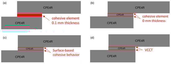 Modeling strategies for nonzero adhesive thickness. (a) Cohesive element with 0.1 mm thickness. (b) Cohesive element with 0 mm thickness. (c) Surface-based cohesive behavior. (d) VCCT.