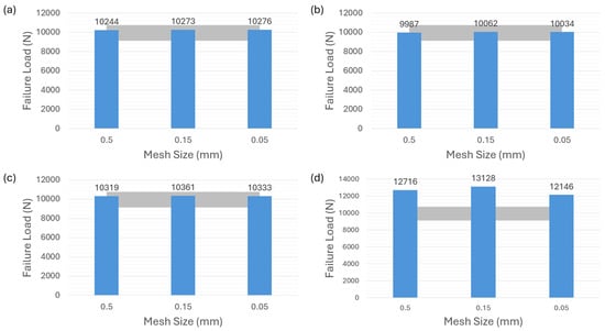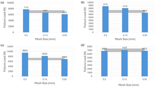 Figure 6 shows the failure-load predictions for the adhesive AV138. It can be seen that Figure 6a–c, corresponding to the modeling strategies of cohesive law in Figure 4a–c, underscore the substantial sensitivity to different mesh sizes for AV138 material. The grey color area in the figures indicates the reference [35] experimental results of the brittle adhesive AV138 ranging from about 6500 N to 7500 N, which is applied to the following related figures in the article. Noted that all the predictions do not fall within the experimental range except for the case in Figure 6a with a mesh size of 0.05 mm. However, Figure 6d highlights an interesting phenomenon observed with the VCCT-modeling strategy corresponding to the Figure 4d. In contrast to adhesive 2015, the failure-load predictions for adhesive AV138 consistently align with the experimental range in this VCCT case.