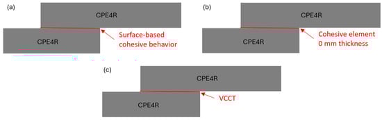 Modeling strategies for zero adhesive thickness. (a) Surface-based cohesive behavior. (b) Cohesive element with 0 mm thickness. (c) VCCT.