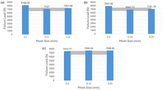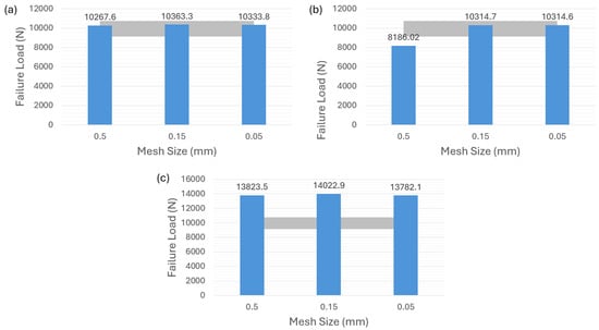 Turning to the adhesive AV138, it is evident that the surface-based cohesive behavior in Figure 9a and the zero-thickness cohesive element in Figure 9b result in an overestimation of the failure load for a mesh size of 0.5 mm. The other two finer mesh sizes, however, do not significantly affect the failure-load prediction. Finally, Figure 9c illustrates that the overall results of the VCCT approach very slightly exceed the experimental values, but it also shows a better mesh-sensitivity result compared to the other two modeling strategies as well as a more accurate prediction than the one for adhesive 2015 in Figure 8c.