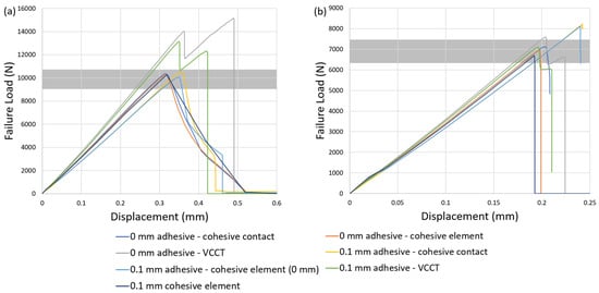 In Figure 10a, it can be observed that among the seven modeling strategies for ductile adhesive 2015, the failure-load predictions for both VCCT approaches with zero and nonzero adhesive thickness significantly exceed the range of experimental values. In addition, sudden-drop failure curves are observed that do not capture the force-displacement curve of ductile adhesive obtained from the experiments [35]. On the other hand, although the other five CZM modeling strategies exhibit subtle discrepancies regarding the failure-load prediction regardless of the adhesive thickness, they are all in good agreement with the failure load and the force-displacement curve in experiments [35]. Thus, it can be observed that, regardless of whether the adhesive thickness is considered, the VCCT approach appears to be less suitable than the CZM approach for predicting the failure load of the ductile adhesive. It is suggested that these five CZM modeling strategies all predict the failure load of ductile adhesive without observing the significant effect of mesh sensitivity.
