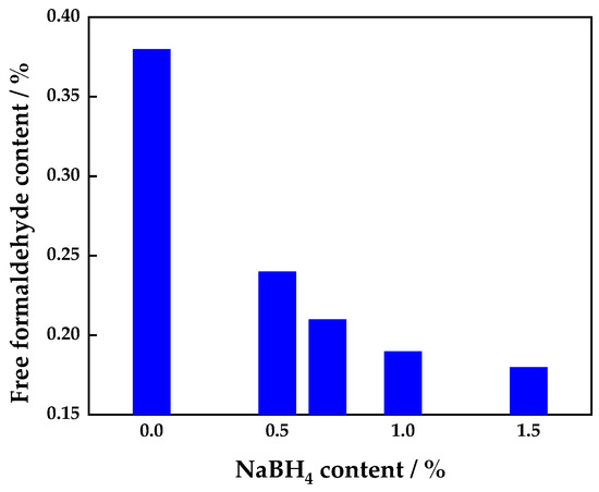 The free formaldehyde content in the modified UF adhesive decreased with increasing sodium borohydride content. When 0.7% sodium borohydride was added to the UF resin adhesive, the free formaldehyde content was 0.21%. Compared to the control UF resin, the free formaldehyde content was reduced by 53%, which exceeded the removal rate of free formaldehyde from the UF resin when using amine as the scavenger (50%) [23].