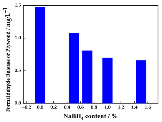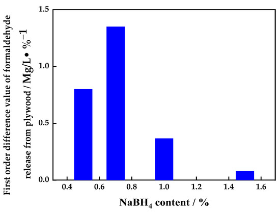 Figure 4 shows the relationship between the sodium borohydride content in the UF adhesive and the first-order difference value of the formaldehyde released from the plywood. It can be seen from Figure 4 that the first-order difference value of the formaldehyde released from the plywood had a maximum value of 1.35 mg·L−1·(% NaBH4)−1 for plywood prepared using the UF adhesive modified with 0.7% sodium borohydride, reflecting the best inhibitory effect.