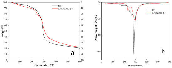 Figure 6 shows the TG (a) and DTG (b) traces of the UF resins (pure UF and 0.7% NaBH4-UF resins). The thermal degradation process of the UF adhesive can be divided into three main stages: