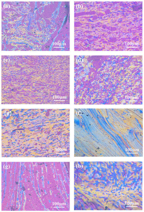 The content of the mesophase has a crucial influence on the properties of the carbon materials. Pitch with high mesophase content, suitable softening point, and viscosity/temperature performance usually requires a planar molecular structure and relatively uniform molecular weight distribution in order to prepare high-quality mesophase-pitch-based carbon fibers [24]. Figure 2 shows the polarized texture images of the mesophase pitch (SP 270 ± 2.5 °C) prepared with different mass fractions of refined naphthalene at 210 °C (a–c) and 220 °C (d–g), respectively. The mesophase pitch catalytically synthesized with HF/BF3 was used as the control group (h).