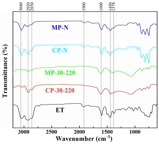 As shown in Figure 3, the infrared spectra of the two series of catalytic pitches and mesophase pitches show strong vibrations at 750~870 cm−1, 1450 cm−1, 1600 cm−1, and 2700~2970 cm−1, which are attributed to the out-of-plane vibration of aromatic C-H, the bending vibration of methylene (including naphthenic) C-H, the stretching vibration of the C=C of the aromatic rings, and the stretching vibration of methyl C-H, respectively [25,26]. It indicates that the two series of pitches eventually form polycyclic aromatic hydrocarbon molecules rich in methyl and methylene groups (including naphthenic structures). The peaks at 3040 cm−1 (aromatic CH stretching vibration) and 750–870 cm−1 of CP-N and MP-N show stronger signals than those of CP-30-220 and MP-30-220, especially at 750 cm−1 (mono-substituted aromatic CH out-of-plane bending vibration), indicating that these pitches contain more aromatic hydrogens and cata-condensed structures [27]. In contrast, the structure of ethylene tar is more complicated, and the pitches are composed of a large number of aliphatic hydrocarbons and olefins. After catalytic polymerization, the out-of-plane vibrations of the aromatic rings of the ethylene-tar-derived pitch are not obvious, but the C=C double bond stretching vibrations located at 1600 cm−1 are more obvious compared with the naphthalene-derived pitch, indicating that the catalytic polymerization tends to be peri-condensed. Moreover, there are obvious peaks at 1020 cm−1 for CP-30-220 and MP-30-220, indicating that the oxygen in the ether is involved in the reaction. However, both of them contain a large number of naphthenic hydrocarbons, methylene structures (1450 cm−1, 2700~2970 cm−1), and shorter-chained aliphatic structures (1378 cm−1), which keep their low viscosity and subsequently form a streamlined mesophase structure.