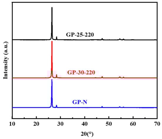 The lamellar aromatic structure of mesophase pitch plays an important role in the formation of the carbon network structure with fewer defects after heat treatment, developing a nearly perfect graphite crystal structure. MP-25-220, MP-30-220, and MP-N were directly graphitized at 3000 °C to obtain graphite powder, and the graphitized structure was analyzed by XRD with Si as the internal standard. Figure 5 shows the XRD patterns of GP-25-220, GP-30-220, and GP-N. It can be seen from Figure 5 that a sharp diffraction peak appears near 26°, which belongs to the (002) plane diffraction peak [30], indicating a perfect crystal structure after graphitization. The crystal parameters of the graphitized samples obtained by fitting the full XRD patterns are shown in Table 3.