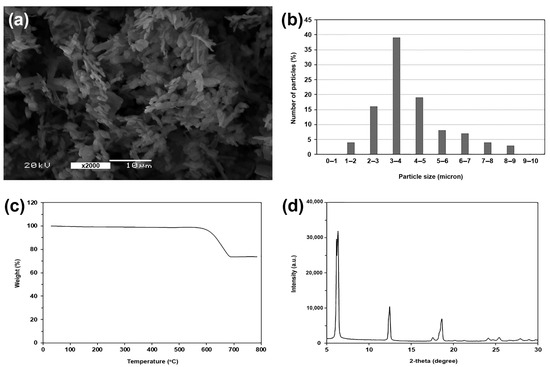 The chain-extended PLLA-PEG-PLLA was synthesized through ring-opening polymerization of L-lactide monomer, as described in our previous works [24,36]. PEG with molecular weight of 20,000 and stannous octoate were used as the initiating system. The number-averaged molecular weight (Mn) and dispersity (Ð) obtained from gel permeation chromatography (GPC) of the obtained PLLA-PEG-PLLA were 108,500 and 2.2, respectively. PPZn was synthesized from phenylphosphonic acid (98%, Acros Organics, Geel, Belgium) and zinc chloride (ZnCl2, 98%, Acros Organics, Geel, Belgium) according to the literature [29]. Figure 1a shows a SEM image of the obtained PPZn powder. The average particle size of 100 PPZn particles determined from the SEM image using an ImageJ program was 4.12 ± 1.60 µm. The particle size distribution of PPZn powder is presented in Figure 1b. The thermal decomposition of PPZn powder determined from the thermogravimetric (TG) thermogram was in the range of 550–700 °C, as shown in Figure 1c. The residue weight at 800 °C of PPZn powder was about 73%. The XRD pattern of PPZn powder is illustrated in Figure 1d, with XRD peaks at 6.5°, 12.6°, and 18.5°.