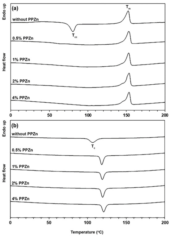 The PLLA-PEG-PLLA composites with different PPZn contents were prepared to compare the nucleating effect of PPZn on the non-isothermal and isothermal DSC scans of the PLLA-PEG-PLLA matrix, as shown in Figure 2 and Figure 3, respectively. In Figure 2a, the glass transition (Tg), cold crystallization (Tcc), and melting (Tm) temperatures are seen on the DSC heating thermograms. In Figure 2b, the crystallization temperature (Tc) is seen on the DSC cooling thermograms. The DSC results of both the DSC heating and cooling scans are summarized in Table 1. The Tg, Tcc, and Tm values of PLLA end-blocks of pure PLLA-PEG-PLLA were 31 °C, 81 °C, and 152 °C, respectively. The Tg and Tcc values of pure PLLA-PEG-PLLA disappeared when the PPZn was incorporated. This may be due to the glassy-to-rubbery transition in amorphous regions of PLLA end-blocks after quenching from 200 °C to 0 °C being difficult to detect by DSC for PLLA-PEG-PLLA composites because the free volume of the polymer chains was reduced for high-crystallinity polymers, which leads to restricting the motion of polymer chains in amorphous regions [42]. The disappearance of a Tcc peak of the PLLA-PEG-PLLA matrix indicates that the composites underwent complete crystallization during quenching from 200 °C to 0 °C [38,43,44]. It should be noted that lower-temperature shoulder Tm peaks were also detected when the PPZn was incorporated, which suggests that imperfect crystals of PLLA end-blocks were formed [29].