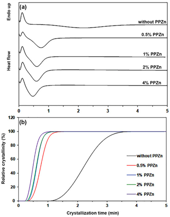 (a) Isothermal crystallization curves at 120 °C and (b) relative crystallinity–crystallization time curves of PLLA-PEG-PLLA/PPZn composites with various PPZn contents.