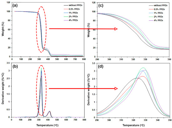 (a) TG and (b) DTG thermograms of PLLA-PEG-PLLA/PPZn composites with various PPZn contents as well as (c) expanded TG and (d) expanded DTG thermograms in decomposition region of PLLA end-blocks.