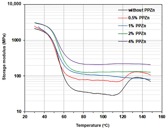 Storage modulus as a function of temperature of PLLA-PEG-PLLA/PPZn composite films with various PPZn contents.