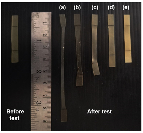 The dimensional stability to heat of film samples at 80 °C under the load of 200 g for 30 s was also used to examine their heat-resistant properties. The film samples with higher heat resistance exhibited shorter final lengths and higher values of dimensional stability to heat [39,40]. Images of pure PLLA-PEG-PLLA and composite films before and after dimensional stability testing are displayed in Figure 7. It can be seen that the pure PLLA-PEG-PLLA showed the longest film extension, indicating that it had the lowest heat resistance. The film extension significantly decreased as the PPZn content increased.