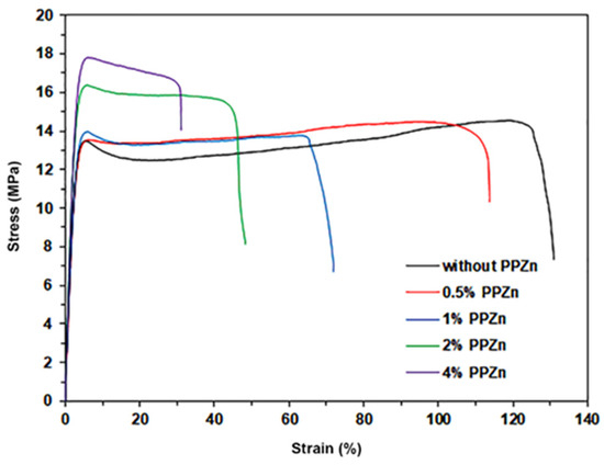 Tensile curves of PLLA-PEG-PLLA/PPZn composite films with various PPZn contents.