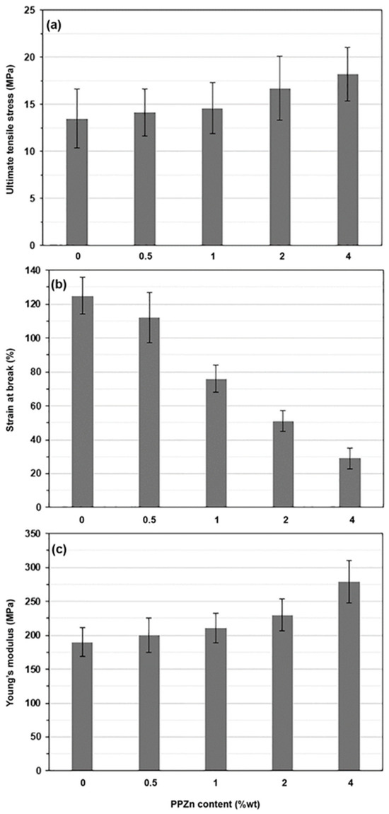 (a) Ultimate tensile stress, (b) strain at break, and (c) Young’s modulus of PLLA-PEG-PLLA/PPZn composite films with various PPZn contents from Table 4.