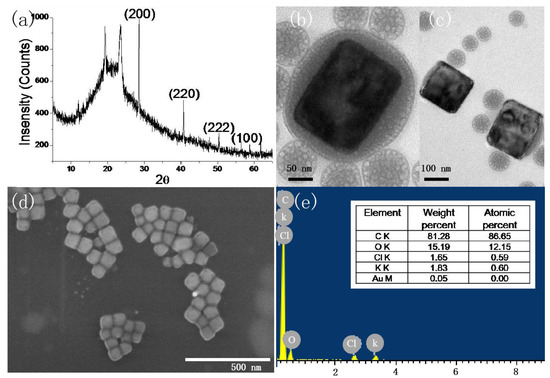 X-ray crystallographic (a), TEM (b,c), SEM (d), and energy-dispersive X-ray spectrometry (e) of KCl nanocubes (pH: 8.3, 50 g/L P123).
