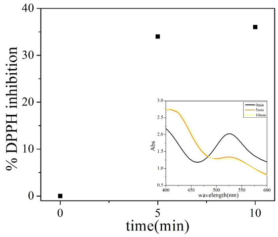 P123 acts as a reducing agent and stabilizer in the synthesis of AuNPs. Gomes et al. used cyclic voltammetry to test the redox potential of gold nanoparticles synthesized in the presence of the block copolymer Pluronic F127. F127 has an oxidation potential of +0.11 V, which is lower than the Au(III) reduction potential of +0.56 V, and therefore, F127 is able to reduce chloroaurate [34]. Since P123 has a similar molecular structure as F127, it is supposed to also have the capacity to reduce chloroaurate. Marina Sokolsky-Papkov demonstrated that the free radical mechanism dominates in the synthesis of gold nanoparticles from polymer composites. Through the characterization of gel permeation chromatography (GPC) and 1HNMR, the fragment of Pluronic after the reaction of the chloroaurate and Pluronic was detected [35]. In this work, the free radical scavenger DPPH was added during this reaction. As shown in Figure 6, after the addition of DPPH (0 min), a major absorbance was observed at 527 nm, which is a signal due to DPPH in its oxidized form. After 10 min, the adsorption clearly shows a decrease in the band at 527 nm and an increase in the band at 419 nm, which is the reduced form of DPPH (Figure 6 inset). DPPH reached an inhibition of 36% within 10 min (Figure 6), which clearly indicates the reduction of chloroaurate by P123 also generates free radicals.
