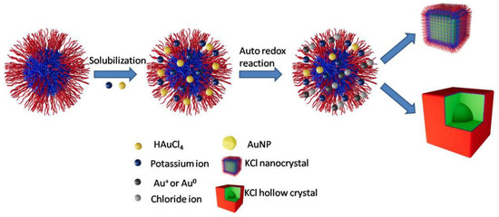 Firstly, potassium cations and chloride anions are met with intermicellar exchange. Secondly, there is a small amount of water inside Pluronic micelles. With the amount of potassium and chloride increased, a supersaturated solution of potassium chloride is formed, and potassium chloride crystallizes from the solution. Finally, potassium and chloride are diffused into the micelles, and nanocrystals with a confined size are formed. The formation mechanism of KCL nanocrystals and hollow micro-crystals is shown in Figure 7.
