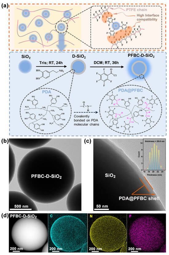 To obtain PTFE composites with low CTEs, the fillers should have both low CTEs and Dk with Df, and SiO2 particles are excellent candidates with a CTE of 0.5 ppm/°C, Dk of 3.9, and Df of 0.002 [3,10]. These favorable properties make SiO2 suitable for reducing the CTE of the PTFE composite. As it can be seen in Figure 1a, SiO2 particles are coated by PDA in advance via the polymerization of dopamine monomers at room temperature (RT) with the aid of Tris for 24 h. Subsequently, PFBC is adopted to react with the −NH2 of PDA to form the imide group (−CO−NH−) through amidation [12]. Hence, the pentafluorobenzene ring is covalently bonded with the PDA molecule chain. The fluorine-containing-group-modified PDA shell contains both hydrophilic groups with strong polarization (−OH, −CO−NH−, etc.) and hydrophobic groups with weak polarization (pentafluorobenzene ring). It can be found that a thin polymer shell (average thickness = 20.6 nm) is coated on the surface of the SiO2 particle in the local high-resolution TEM images of PFBC-D-SiO2 (Figure 1b,c). As shown in Figure 1d, C and N atoms are distributed on the surface of SiO2. Furthermore, a high amount of F atoms can also be detected on the surface of SiO2 originating from the introduced pentafluorobenzene ring. It demonstrates that the modified PDA shell (PDA@PFBC) exists well on the surface of SiO2 particles.