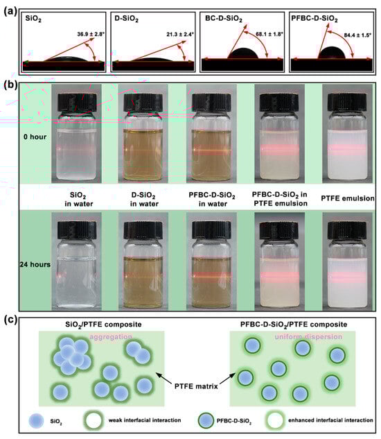To estimate the dispersible stability after filler incorporation, a 24 h sedimentation experiment of the fillers in water is conducted, which is combined with the observation of the Tyndall effect of these dispersion solutions (Figure 3b). At the beginning of the experiment (0 h), all dispersions show an obvious Tyndall effect that exhibits a bright red-light path through the solutions in vials. After standing for 24 h, SiO2 particles settled to the bottom of the vial and almost lost the Tyndall effect, while the red-light path in the D-SiO2 aqueous solution remains clear and bright. This phenomenon indicates that the D-SiO2 presents a strong hydrophilicity and results in a dispersion stability [27,28]. As for the PFBC-D-SiO2 aqueous solution, it displays a clear and bright red-light path after 24 h as well as 0 h status. It indicates that PFBC-D-SiO2 fillers have the ability to disperse stably in water [28,29]. Furthermore, the PFBC-D-SiO2 particles in the PTFE aqueous emulsion indicate the transformation of the red-light path during sedimentation. Similar to the phenomenon of PFBC-D-SiO2 in water, the red-light path remains bright after 24 h of sedimentation, demonstrating the excellent dispersibility in the PTFE aqueous emulsion. Therefore, Figure 3c illustrates that the PFBC-D-SiO2 fillers can be dispersed uniformly in the PTFE composites and can interact efficiently with the PTFE matrix.