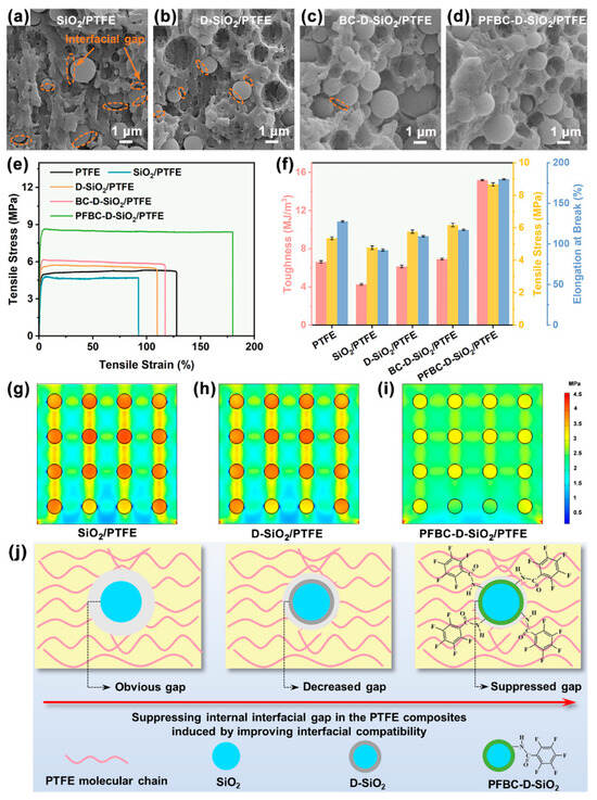 Interfacial bonding states of the interface between fillers and the PTFE matrix. SEM micrographs of the brittle-fractured cross-sections of the (a) SiO2/PTFE, (b) D-SiO2/PTFE, (c) BC-D-SiO2/PTFE, and (d) PFBC-D-SiO2/PTFE composites with 30 vol% of fillers; (e) stress–strain curves and (f) the corresponding toughness, tensile stress, and elongation at break of the PTFE composites with 30 vol% of fillers. The stress distribution model of (g) SiO2/PTFE, (h) D-SiO2/PTFE, and (i) PFBC-D-SiO2/PTFE under the vertically upward load calculated by COMSOL; and (j) illustration of the suppressed internal interfacial gap in the PTFE composites induced by improving the interfacial compatibility between fillers and the PTFE matrix.