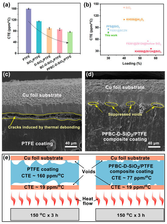 Suppressed thermal debonding in CCL induced by the PTFE composites: (a) CTEs of neat PTFE and the PTFE composites with 30 vol% of fillers; (b) comparison between this study and the reported studies in the aspects of CTE and filler loading; thermal debonding images in CCL containing (c) neat PTFE coating and (d) PFBC-D-SiO2/PTFE composite coating; and (e) mechanism of the thermal debonding in CCL under high-temperature operation conditions.