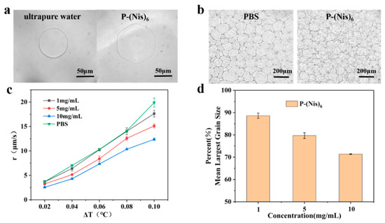 (a) Optical images of ice crystal morphology in ultrapure water and P-(Nis)6 solution with a concentration of 10 mg/mL at a ΔT of 0.08 °C; (b) ice crystal microscopic images of PBS buffer and P-(Nis)6 solution at 10 mg/mL after annealing at −6 °C for 30 min; (c) ice crystal growth rates of PBS buffer and P-(Nis)6 solution; (d) MLGSs in P-(Nis)6 solution as percentages of those in PBS buffer.