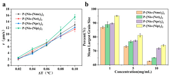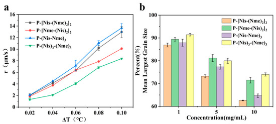 (a) Ice crystal growth rates in solutions of peptoid oligomers with different hydrophobic side chains at concentration of 10 mg/mL; (b) percentages of ice crystal MLGSs of peptoid oligomers with different hydrophobic side chains in PBS buffer.