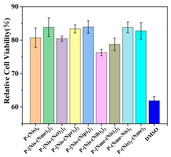 To further verify the potential of peptoid oligomers as biological cryoprotectants, cytotoxicity tests were performed. DMSO, as a common cryoprotectant in practical applications, was used to compare with peptoids in a cytotoxicity test. Generally speaking, samples with a cell survival rate of less than 75% are considered to be cytotoxic [36]. The results show that the relative cell viability of all peptoid oligomer solutions was greater than 75% at a concentration of 10 mg/mL, which is considered to be non-cytotoxic (Figure 4). The relative cell viability of DMSO was only 61.9%, confirming the presence of cytotoxicity. It can be concluded that the peptoid antifreeze agents prepared here have comparative or better antifreeze properties than DMSO but safer (Figures S6, S9 and S10). The results of this study undoubtedly confirm the potential of peptoids as antifreeze agents in cryopreservation.