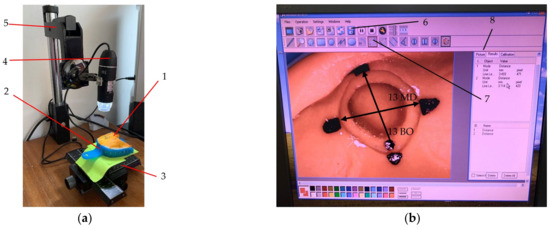 The measurement of a condensation silicone impression (1) in the standard impression tray (2): (a) dental impression positioned on (3) the sliding platform to allow for repeatability, with the position of the impression marked on the green paper; (b) the image captured by the camera (4) mounted on the system (5) for vertical adjustment of its position, as visualized on the screen. The image in (b) shows abutment 13 with markings for measuring both mesial-distal (MD) and buccal-oral (BO) distances. The button (6) for saving the images and the button (7) for measuring the distance between two points, while (8) shows the library with all saved images. Two distances are marked on the figure: the mesial-distal distance for the considered abutment (13 MD) and the buccal-oral distance for this abutment (13 BO).
