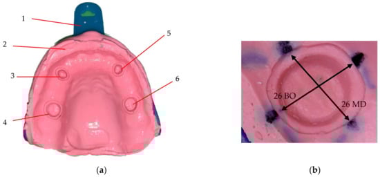 All impressions were measured using the digital camera, as shown in Figure 1. In order to decrease the impact of errors, the position of the tray (2) (Figure 1a) was marked. Therefore, each impression (1) could be placed in the same position. Also, all the measuring points were marked on the impressions, as presented in Figure 1b. These aspects were a necessary measure in order to obtain an as high as possible reproducibility of the measurements. For each of the four abutments on an impression, the measurements were made in two perpendicular directions, i.e., mesial-distal (MD) and buccal-oral (BO), as presented in Figure 1b and Figure 3b.