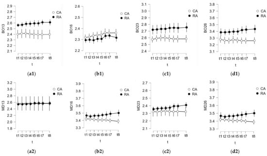 During the initial stage, data analyses were conducted. We scrutinized measurements taken at the considered time moments tk, k = . Both the mean and standard deviation (SD) were computed for the entire dataset spanning these eight moments. Figure 4, Figure 5 and Figure 6 show these means and SDs from t1 to t8 for the six data sets obtained for both BO and MD measured distances (corresponding to the six study groups). In order to facilitate an easier comparison between the conventional and mouthguard-reinforced impressions, both means and SDs were grouped for each type of measurement (CA with RA, CCS with RCS, CAS with RAS) for each of the three considered materials, in each corresponding figure, from Figure 4, Figure 5 and Figure 6.