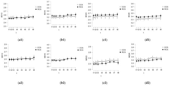 Results of the analysis performed at specific time moments for condensation silicone regarding the comparison between conventional impressions (Group 2: CCS) and mouthguard-reinforced impressions (Group 4: RCS) for (1) BO and (2) MD, for the abutments (a) 13, (b) 16, (c) 23, and (d) 26.