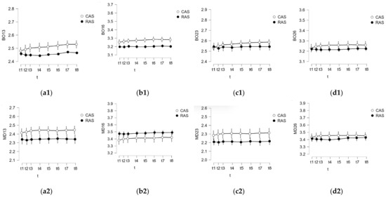 Results of the analysis performed at specific time moments for addition silicone regarding the comparison between conventional impressions (Group 3: CAS) and mouthguard-reinforced impressions (Group 5: RAS) for (1) BO and (2) MD, for the abutments (a) 13, (b) 16, (c) 23, and (d) 26.