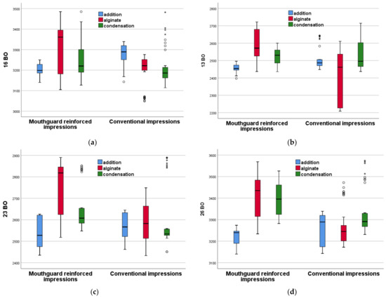 Boxplots for the mouthguard-reinforced impressions compared to conventional impressions for each of the three considered materials, for: (a) 16 BO, (b) 13 BO, (c) 23 BO, and (d) 26 BO. Explanations of the notations are made in the text.