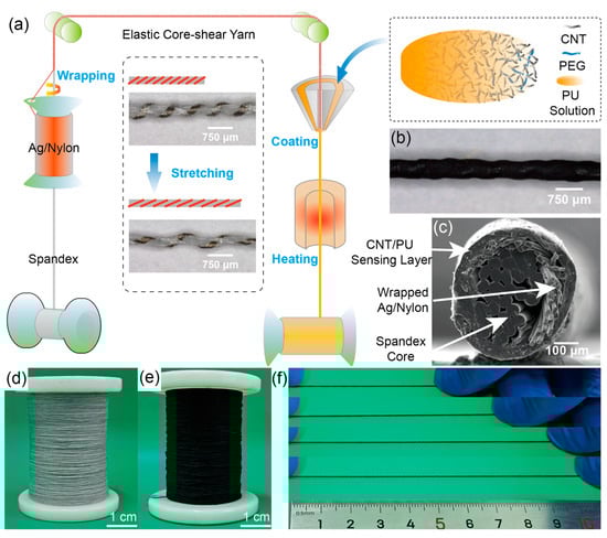 Materials: Spandex (560 D, 840 D, 1160 D, 1680 D, purchased from Zhuji Haoting Chemical Fiber Trading Co., Ltd., Shaoxing, China), silver-plated nylon yarn (Ag/Nylon, purchased from Suzhou Tike Silver Fiber Technology Co., Ltd., Suzhou, China), carbon nanotubes (CNT, purchased from Shenzhen Turing New Materials Co., Ltd., Shenzhen, China), polyethylene glycol (PEG, molecular weight 2000, purchased from Shanghai National Medicines Group Chemical Reagents Co., Ltd., Shanghai, China), N,N dimethylformamide (DMF, purchased from Shanghai National Medicines Group Chemical Reagents Co., Ltd., Shanghai, China), polyurethane (PU, purchased from Guangzhou Boteng New Material Technology Co., Ltd., Guangzhou, China), and copper wire (0.2 mm, purchased from Dongguan Qianlong Nonferrous Metal Materials Co., Ltd., Dongguan, China).