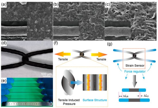 A different morphology on the surface of the CNT/PEG/PU/DMF solution coated onto the elastic core shear yarn was observed with PU prepared using 60 A, 70 A, and 80 A PU, as shown in Figure 2a–c. The surface of the MPF exhibited granular protruding structures, with larger particle sizes observed for MPFs prepared using PU with a higher modulus. This difference in particle size may be attributed to the varying concentration and viscosity characteristics of the dissolved PUs. The magnified SEM image in the top right corner of Figure 2b shows the surface of the MPF with added CNTs distributed randomly within the PU matrix, which is attributed to the lack of employing high-speed stretching or other processing methods that could induce CNT alignment. The resistances obtained from preparing MPF using 60 A, 70 A, and 80 A PU are 1.03 kΩ, 2.35 kΩ, and 2.94 kΩ, respectively. Figure 2d presents an optical microscope image of the entangled structure strain sensor, where two MPFs are in contact at the intersection. Due to the excellent elasticity of the MPF itself, the entangled structure strain sensor exhibits stretchability as well. Figure 2e illustrates photographs of the entangled structure strain sensor stretched at 20%, 40%, and 60% elongation. Based on the surface microstructure of the MPF revealed by the SEM images in Figure 2a–c, the mechanism of resistance variation in the entangled structure strain sensor can be speculated, as shown in Figure 2f. When assembled into a sensor, the complete conductive circuit is formed through the Ag/Nylon electrodes within two MPFs, the CNT/PU sensing layer, and the contact resistance between the CNT/PU layers. During the stretching process, corresponding pressure is generated at the intersection of two MPFs, leading to variations in contact resistance and tunneling resistance between the CNTs in the CNT/PU layers. As a result, the tensile-induced pressure can be obtained by measuring the resistance changes through the Ag/Nylon electrodes in the two MPFs. Additionally, a PU yarn with a different modulus was connected at the tail end of the MPF as a force regulator, as shown in Figure 2g. The different moduli between the MPF and the force regulator result in different deformations ( and ) when the sensor is stretched. By adjusting the modulus and length of the force regulator, the ratio of to can be modified, enabling control over the output curve of the entangled structure strain sensor.
