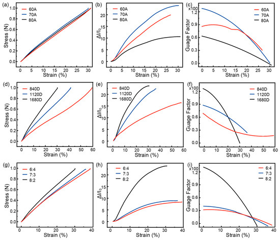 The mechanical and sensing performance of entangled structure strain sensors. The (a) stress–strain curve, (b) current variation curve, and (c) gauge factor for sensors prepared using different PU. The (d) stress–strain curve, (e) current variation curve, and (f) gauge factor for sensors utilizing different thicknesses of PU fibers as force regulators. The (g) stress–strain curve, (h) current variation curve, and (i) gauge factor for sensors with varying lengths of force regulators.